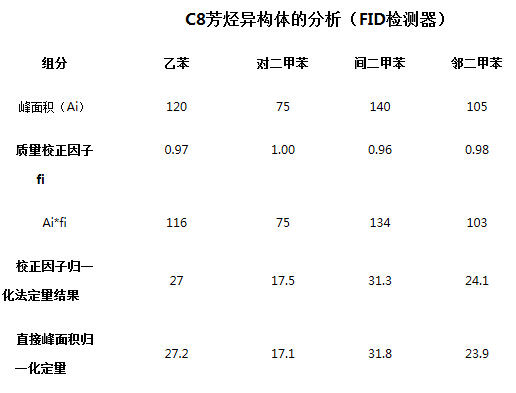 氣相色譜的一些主要檢測(cè)器如FID和TCD對(duì)某些組分,如同系物的校正因子相近或有一定的規(guī)律,從文獻(xiàn)中可以查到或進(jìn)行計(jì)算。當(dāng)校正因于相近時(shí),可直接用峰面積歸一化進(jìn)行定量分,例如下表中給出了C8芳烴異構(gòu)體的分析結(jié)果。四個(gè)組分的FID檢測(cè)器的質(zhì)量校正因子在0.96-1.00之間,結(jié)果給出了用校正因子進(jìn)行歸一化法的定量結(jié)果和直接用峰面積進(jìn)行歸一化的定量結(jié)果。