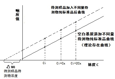 具體操作是取等量待測(cè)樣品若干份,加入不同濃度的待測(cè)組分的標(biāo)準(zhǔn)溶液進(jìn)行分析,以濃度為橫坐標(biāo),峰面積為縱坐標(biāo)繪制工作曲線(xiàn)。工作曲線(xiàn)延長(zhǎng)線(xiàn)在橫坐標(biāo)上的截距即為樣品中待測(cè)組分的濃度。由于待測(cè)組分以及加入的標(biāo)準(zhǔn)溶液處在相同的樣品基體中,相當(dāng)于把待測(cè)試樣作為了背景值。