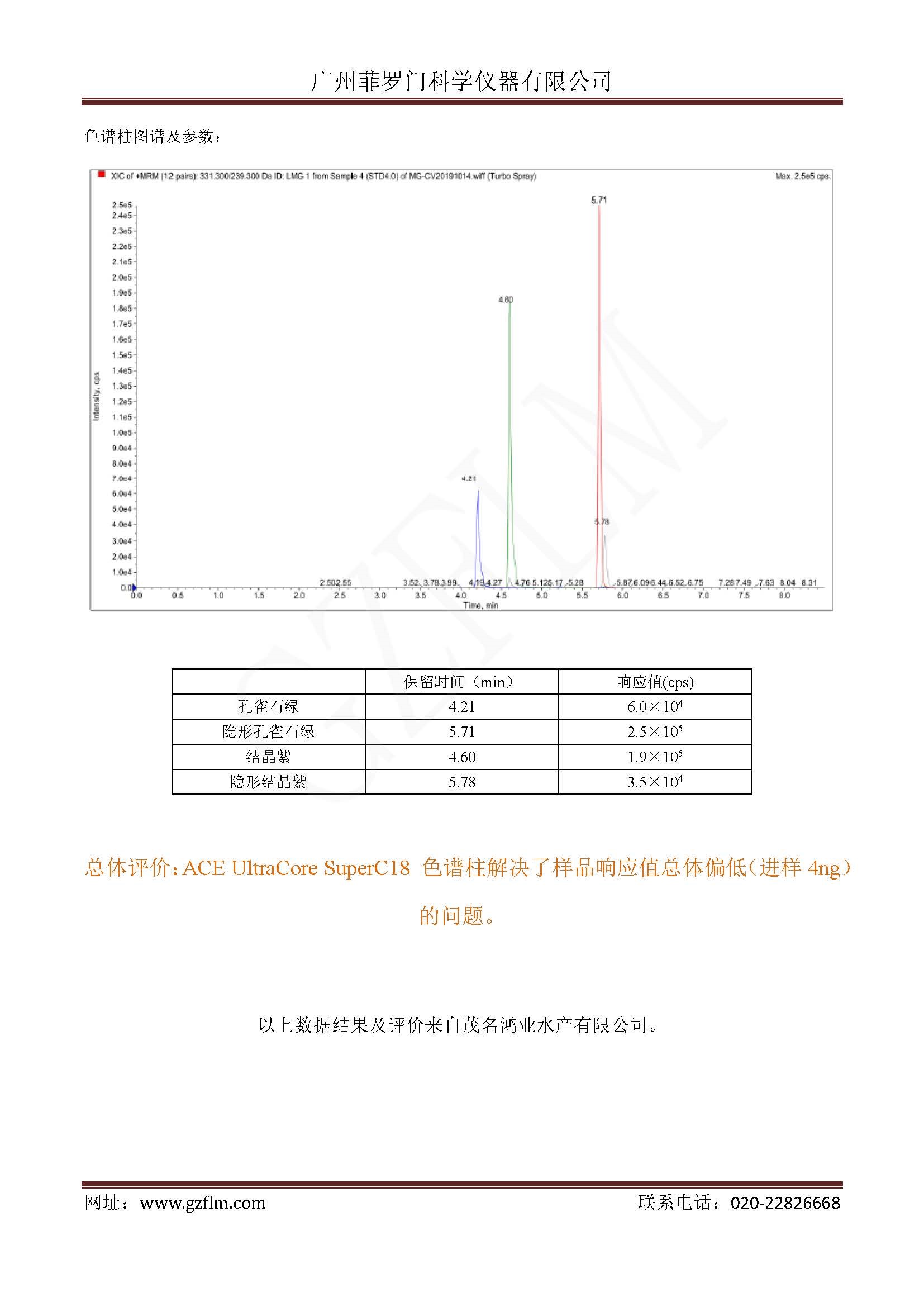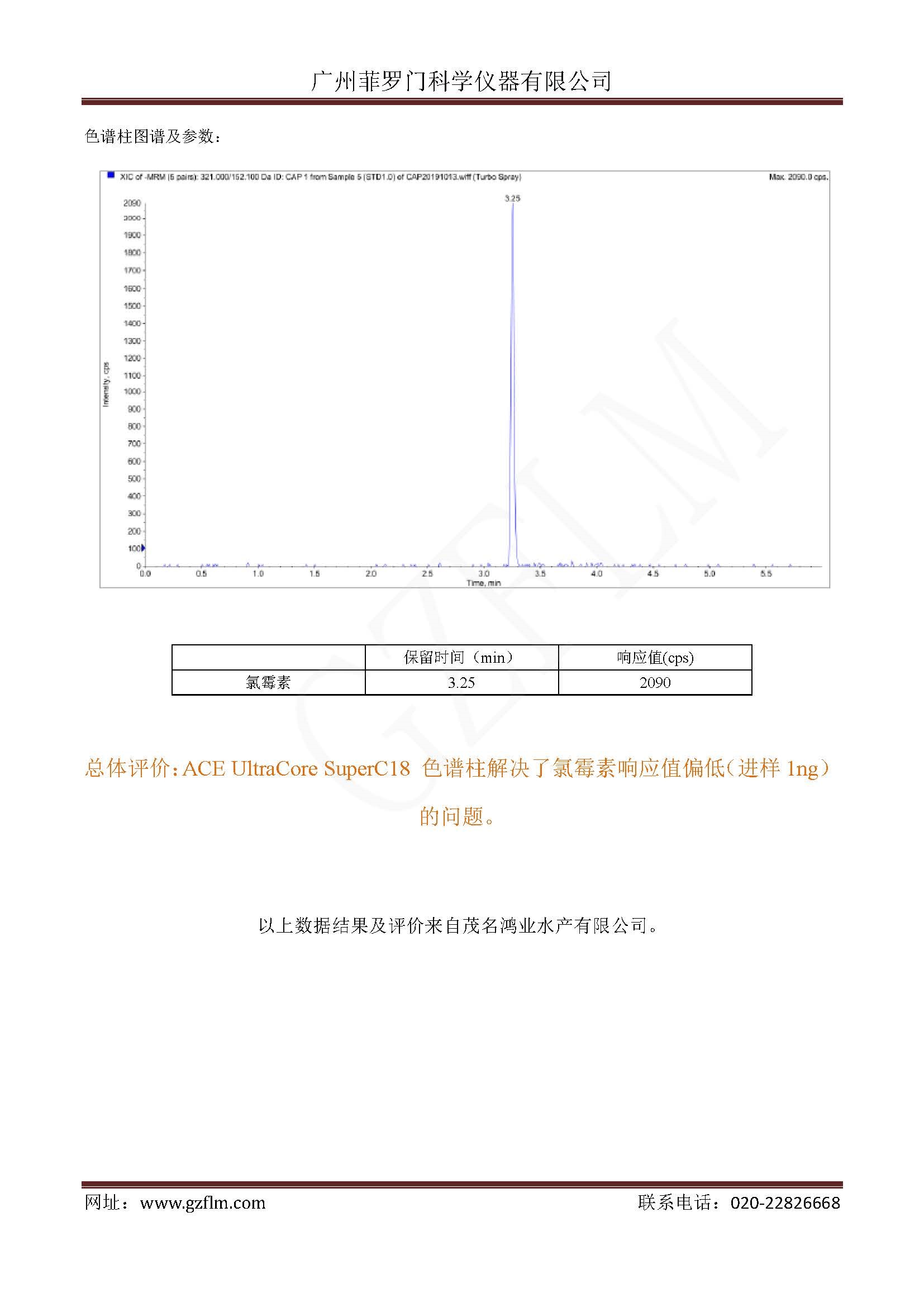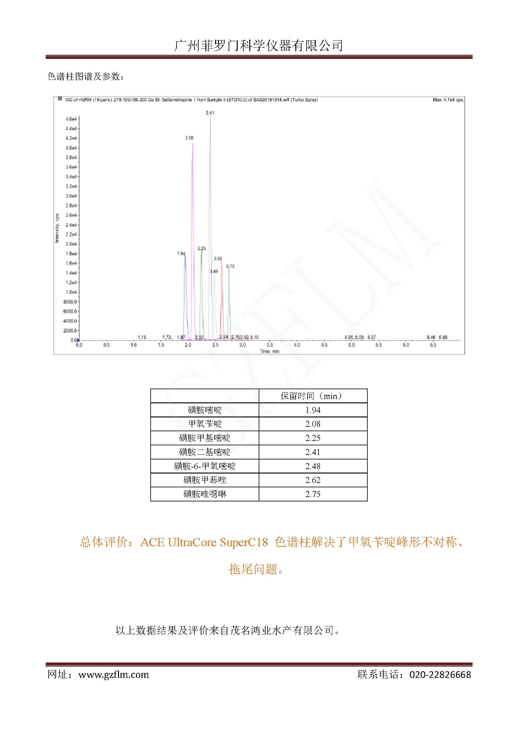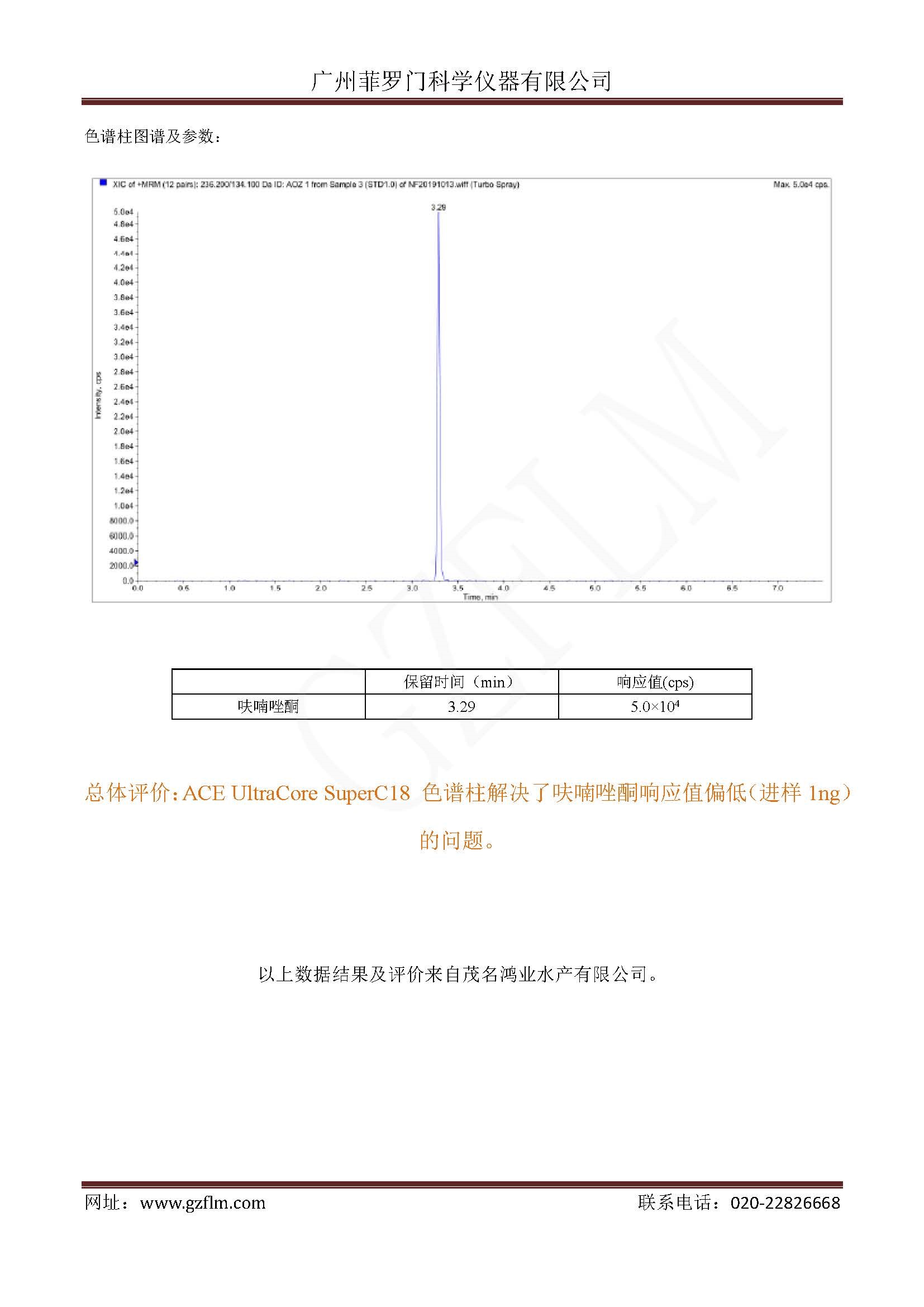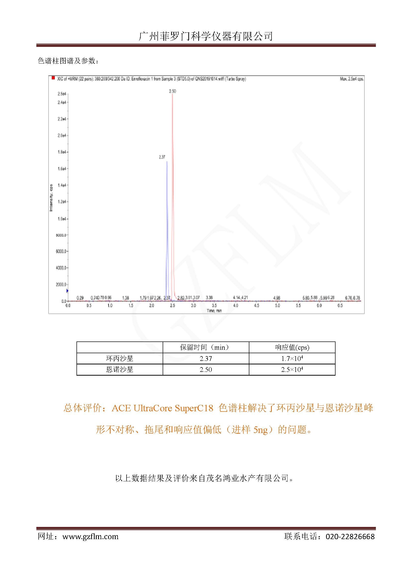 以上由ACE UltraCore Super C18 2.5u 50 X 3.0mm (貨號(hào):CORE-25A-0503U)一根柱子在質(zhì)譜上解決硝基呋喃類、氯霉素類、磺胺類、沙星類、孔雀石綠和結(jié)晶紫水產(chǎn)品中的藥物殘留。