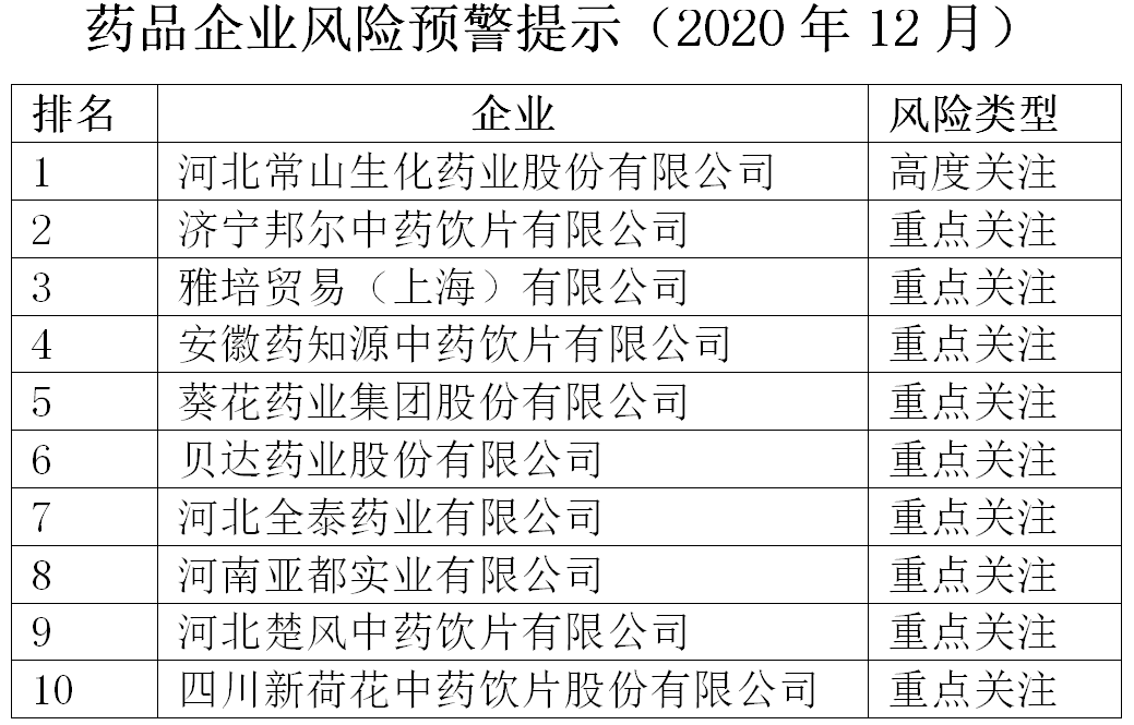 近日,中國健康傳媒集團輿情監(jiān)測中心發(fā)布藥品企業(yè)風險預警提示(2020年12月),公開風險指數排名前十的企業(yè)。河北常山生化藥業(yè)股份有限公司(以下簡稱常山藥業(yè))排名第一,為“高度關注企業(yè)”;濟寧邦爾中藥飲片有限公司、雅培貿易(上海)有限公司、安徽藥知源中藥飲片有限公司、葵花藥業(yè)集團股份有限公司、貝達藥業(yè)股份有限公司、河北全泰藥業(yè)有限公司、河南亞都實業(yè)有限公司、河北楚風中藥飲片有限公司、四川新荷花中藥飲片股份有限公司分列第2至10位,為“重點關注企業(yè)”。