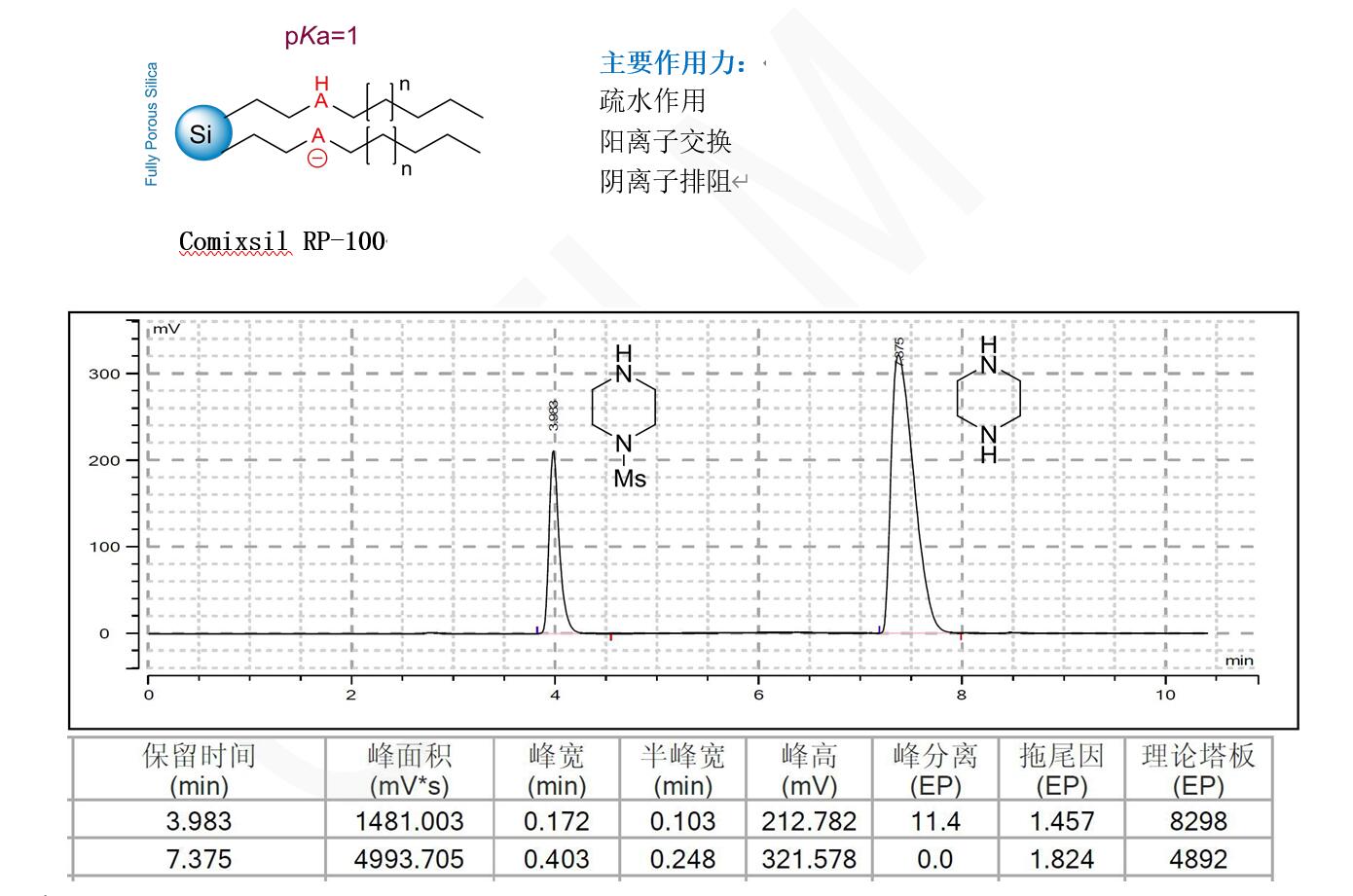 菲羅門Comixsil RP-100 HPLC混合模式色譜柱分離哌嗪和 1-(甲磺酰基)哌嗪