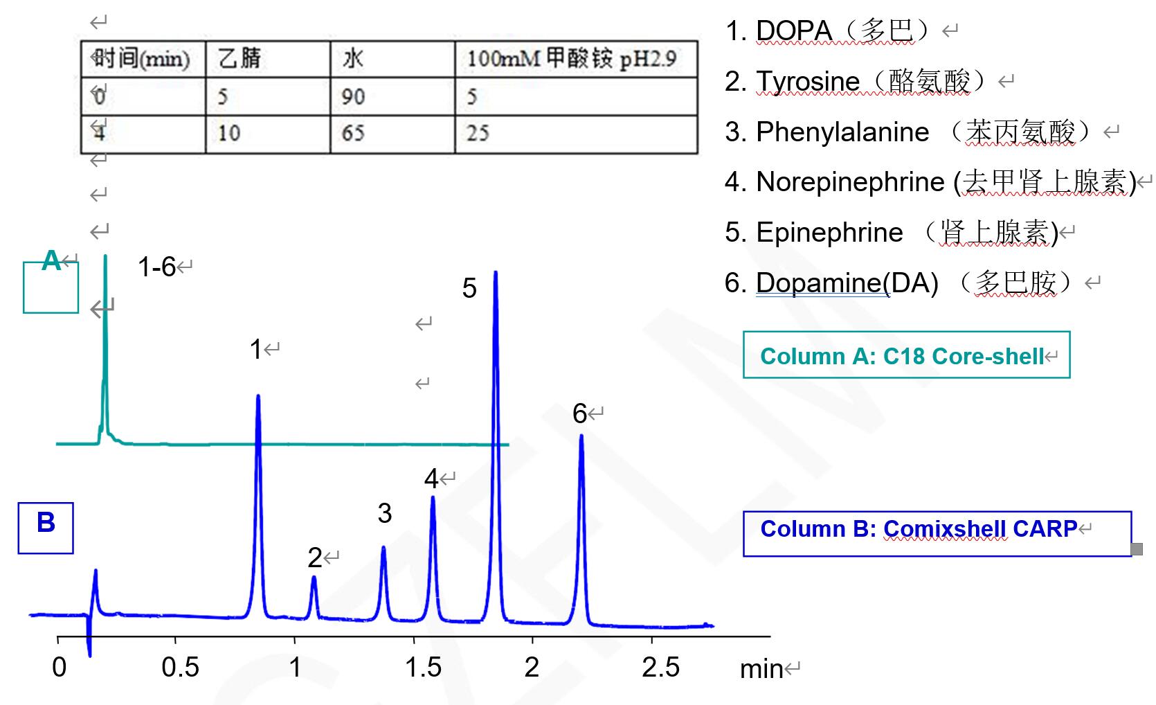 說明:多巴胺等大極性神經(jīng)遞質(zhì)在C18上沒有保留難以分離,采用Comixshell陽離子交換