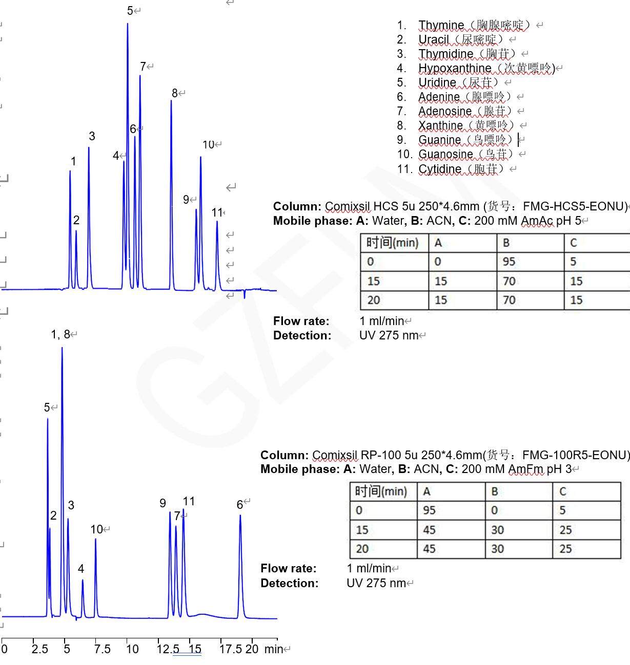 Comixsil HCS與Comixsil RP-100分析核酸堿基與核苷(MS匹配)