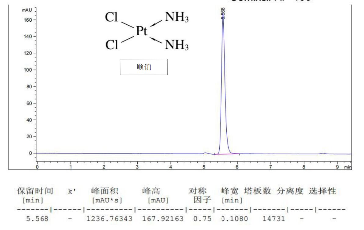 方法說明:中國藥典上順鉑的含量測定中采用離子對試劑走純水相,使用 Comixsil RP-100 陽離子交換+ 疏水混合模式,可以替代原先加離子對的方法,重現性及峰型較好;由于該方法是使用純水相,建議使用 者每天使用完后用乙腈:100mM 甲酸銨(pH3.0)=60:40 沖洗柱子,防止色譜柱污染。