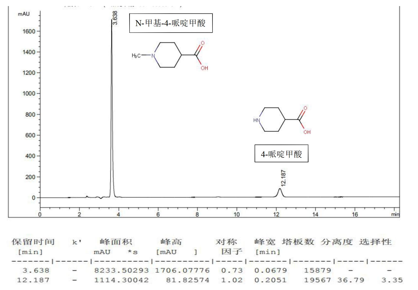 方法說明:N-甲基-4 哌啶甲酸與 4-哌啶甲酸之間相差一個甲基,該差異直接影響了哌啶環上氮原子接受質子的能力,因此可以利用陽離子交換作用進行保留及分離;由于兩者保留時間相差較大,后續調整亦可采用梯度洗脫來改善分析時間。