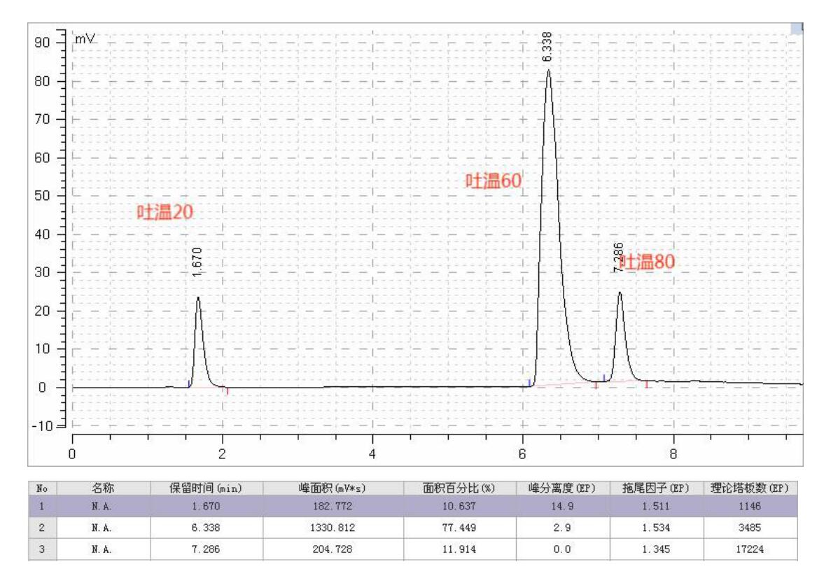 說明:Mercury Tween 吐溫專用色譜柱可實現吐溫 20,吐溫 60 和吐溫 80 的一次性分析,峰形良好。