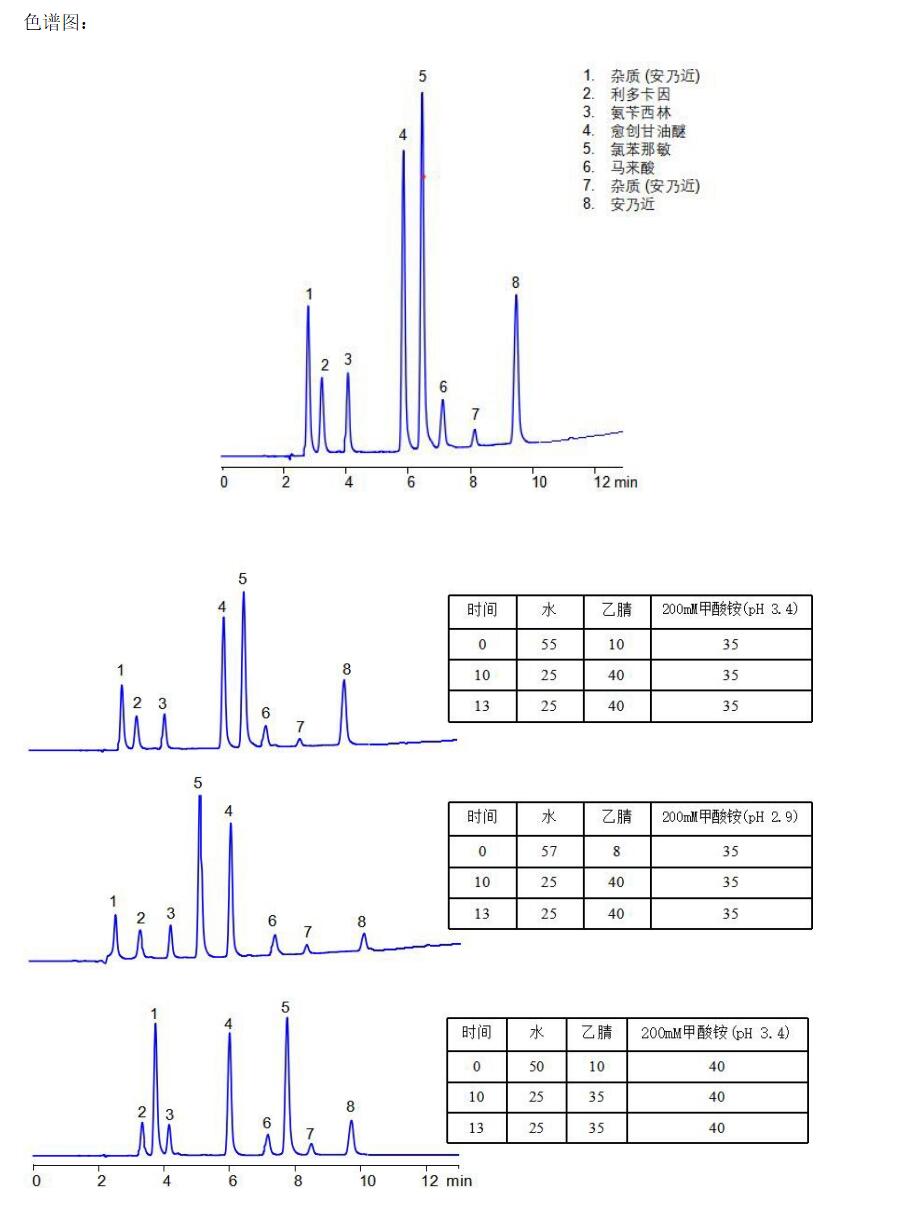 App ID: FLM-C240008 Comixsil RP-AX 同時(shí)分析鎮(zhèn)痛類(lèi)藥物制劑安乃近、利多卡因、愈創(chuàng)甘油醚、馬來(lái)酸氯苯那敏、氨芐西林 色譜柱: Comixsil RP-AX 3μm 150*4.6mm(貨號(hào):FMF-AXR3-EONU) 流動(dòng)相: 時(shí)間 水 乙腈 200mM 甲酸銨(pH 3.4) 0 55 10 35 10 25 40 35 10.01 55 10 35 20 55 10 35 流速:1.0 mL/min 檢測(cè)波長(zhǎng):255nm 柱溫:25℃ 樣品濃度:N/A 進(jìn)樣量:N/A 結(jié)構(gòu)式: