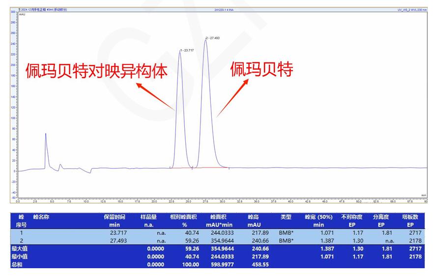 App ID: FLM-B250001 佩瑪貝特及其對(duì)映異構(gòu)體的手性拆分 方法 1: 色譜柱:Chiral INA 5μm 250*4.6mm (貨號(hào):FMG-JY5-I01) 流動(dòng)相:正相(咨詢) 流速:0.8 mL/min 檢測(cè)波長(zhǎng):230nm 柱溫:25℃ 樣品濃度:1mg/ml 稀釋劑:甲醇 進(jìn)樣量:10ul 色譜圖: