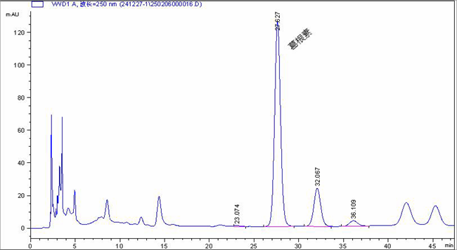 App ID: FLM-S250001 SuperLu C18 柱對(duì)葛根的含量測(cè)定 方法:中國(guó)藥典一部 色譜柱:Superlu C18 5μ 250*4.6mm (貨號(hào):FMG-5252-EONU) 流速:1 mL/min 樣品濃度:1 mg/mL 進(jìn)樣量:10μ 檢測(cè):250nm 流動(dòng)相:甲醇:水=25:75 色譜圖: