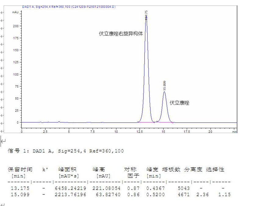 App ID: FLM-B250003 伏立康唑及對映異構(gòu)體的手性拆分 色譜柱:Chiral INC 5um 150*4.6mm (貨號:FMF-JY5-I03) 流速:1 mL/min 檢測:UV254nm, 25oC 樣品濃度:2mg/mL 進樣量:10 μ 溶劑:水 流動相:反相(咨詢) 色譜圖: