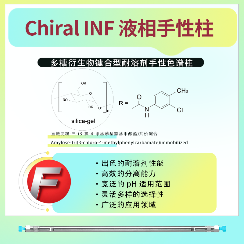 Chiral INF 鍵合型耐溶劑手性柱的固定相為直鏈淀粉-三-(3-氯-4-甲基苯基氨基甲酸酯)共價鍵合,Amylose-tri(3-chloro-4-methylphenyl
