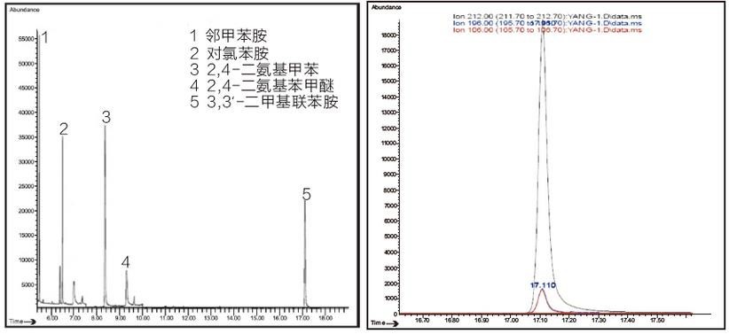 圖 1 部分禁用芳香胺總離子流圖 圖 2 3,3'-二甲基聯(lián)苯胺色譜圖