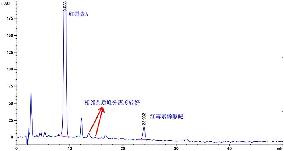 Titank C18 色譜柱分離度可達 20.19,拖尾因子 0.912,且對一些相鄰雜質峰有更好的分離效果。