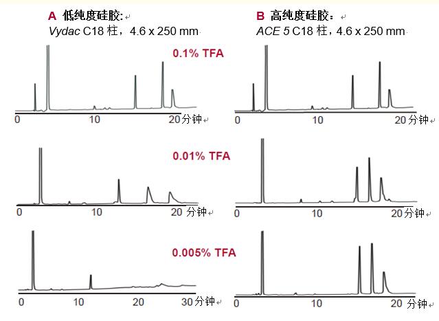 圖7. 硅膠純度會(huì)影響多肽的峰形,尤其是加入的離子對(duì)試劑濃度較低時(shí)。高純度硅膠所需離子對(duì)試劑的濃度遠(yuǎn)比低純度硅膠低。