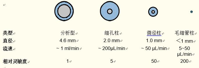 微徑柱的流速為~50微升/分鐘,因此采用微徑柱的靈敏度更高,約為分析柱的50倍。