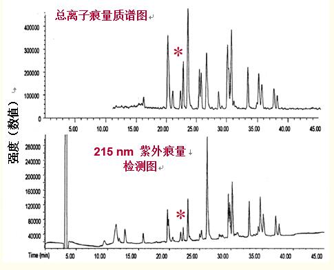 特別是用“*”標(biāo)示的肽對。它們在UV檢測圖譜中顯示的峰值較小,但在質(zhì)譜圖中峰值較大。