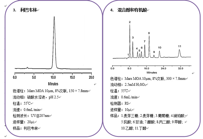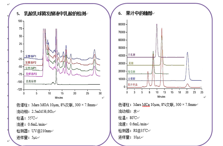 • 菲羅門 Mars系列糖類、有機酸分析柱 MARS系列離子排阻色譜柱由低交聯度的磺化交聯的聚苯乙烯-二乙烯基苯(PS/DVB)顆粒填裝而成,PS/DVB具有背壓低、耐高溫、化學穩定性高等特點。多種作用模式(包括體積排阻、離子排斥、配體交換、反相及正相作用)結合多種離子形式(H、Ca、Pb、Na),提供了非常寬泛的選擇性,適用于糖類和有機酸的分離。